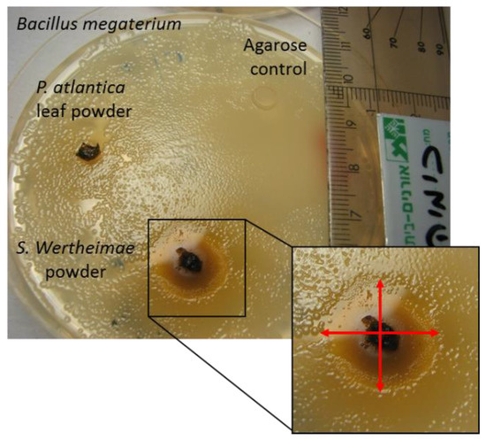 Anti-bacterial activity was tested using the well diffusion or disk assay. For the well diffusion, the tested bacteria were grown to mid-log in LB (shaking at 30 °C), smeared on LB-agar, allowed to dry. The wide part of a glass Pasteur pipette was sterilized by brief flaming and allowed to cool before being used for punching a well in the agar. A total of 10 mg of plant powder was placed in the well by spatula, and covered with molten agarose in water at 50 °C. For the disk diffusion assays a water—agarose mixture (2% agarose) was prepared and autoclaved, allowed to cool to 50 °C, and mixed in final 1:10 (v/w) ratio with plant powder. The molten mixture was poured into an empty Petri dish and allowed to solidify. Disks were extracted and placed on LB agar smeared as above. Molten agarose or agarose disks were used as negative controls. In all cases, the plates were incubated over-night at 30 °C for growth and inhibition of growth around the well/disk measured. All experiments were done in biological triplicates.