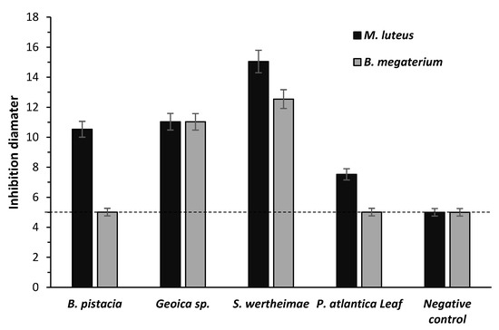 Well diffusion assay results. Note that 5 mm means no inhibition. Black bars are average of triplicates and error bars present one SD. Dashed line present limit of no-inhibition. Bacteria are Micrococcus luteus and Bacillus megaterium.