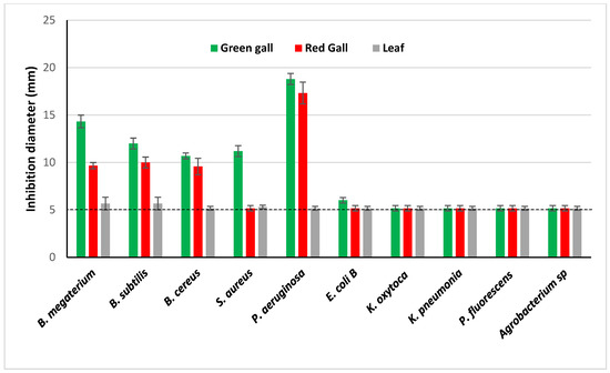 Agar-disk diffusion assay. Note that 5 mm means no inhibition. Bars are average of triplicates and error bars present one SD. Dashed line present limit of inhibition. Bars are average of 3 repeats (galls) or 6 repeats (leaves). Error bars are one SE. Dashed line is limit of no-inhibition. Bacteria are: Bacillus megaterium, B. subtillis, B. cereus, Staphylococcus aureus, Escherichia coli, Klebsiella oxytoca, K. pneumonia, Pseudomonas fluorescens, and Agrobacterium sp.