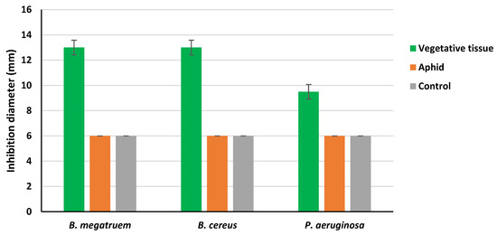 Paper-disk diffusion assay results for methanol extract of S. wertheimae aphids and vegetative part methanolic extract. Bars are average of triplicates and error bars present one SD. Bacteria are as in Figure 3.