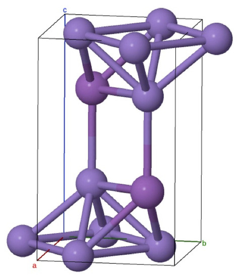 The Mn2Sb compound has a tetragonal structure with the 129th space group (P4/nmm) [7], see Table 1. The Mn atoms are located at two symmetrically independent crystallographic sites: Mn1 (point symmetry: 42 m) and Mn2 (point symmetry: 4 mm). The unit cell contains two crystallographically distinct sites of Mn1 and Mn2, which are respectively surrounded tetrahedrically and octahedrically by the Sb atoms. The ferrimagnetic structure is formed by an antiparallel arrangement of magnetic moments. The crystal structure is shown in Figure 1. The structure is stable over a wide temperature range, with the magnetic structure passing through a series of phase transitions. The magnetic phase transition in Mn2Sb occurs at the Curie temperature TC equal to 550 K [7]. Below this temperature, a ferrimagnetic ordering with unequal magnetic moments of different types of manganese ions is realized in the compound.