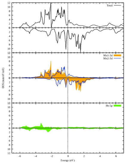 The density of electronic states in Figure 2 and Figure 3 show that in the case of the ferromagnetic and antiferromagnetic arrangements of manganese ions, the Mn2Sb compound has metallic properties and passes a current with only one spin projection—the majority. The figures are plotted relative to the Fermi level (indicated by a vertical dotted line).