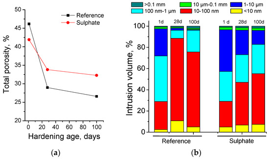 The pore size distributions for the analyzed pastes can be observed in Figure 1b. At one hardening day, the microstructure was more refined for reference specimens, although the relative volume of pores with diameters smaller than 10 nm was higher for sulphate samples, which could be explained in relation to abovementioned influence of gypsum in the hardening of the samples in the very short-term. From 1 to 28 days, the reference pastes showed an important pore refinement, highlighting the rise of percentage of pores with sizes lower than 100 nm (pore ranges <10 nm and 10–100 nm), and since then until 100 hardening ages, the pore structure of these pastes became slightly less refined. This could be due to the microstructure development due to the hydration of clinker [7,8], which would progressively close the finer pores, reducing the porosity and the relative volume of pores of the smaller diameter ranges.