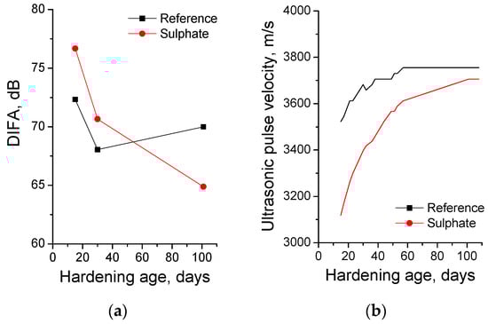 With respect to the NLU technique, the evolution of the parameter DIFA can be observed in Figure 3a. For reference samples, this parameter decreased in the short term and increased later, showing small changes during the studied time period in any case. On the other hand, the parameter DIFA continuously decreased with age for samples exposed to sulphate attack. This would mean that the system gradually turned less linear, which could indicate the beginning of deleterious effects produced by internal sulphate attack, with the formation of microcracks due to formation of expansive products. It is important to highlight that these trends described for parameter DIFA in both reference and sulphate pastes would be overall in keeping with the results of the length change due to expansion (see Figure 2b), which showed scarce changes for reference pastes and a progressive expansion for sulphate ones. Therefore, in view of these preliminary results, it seems that the NLU technique could be useful for providing information about the deleterious processes due to internal sulphate attack.