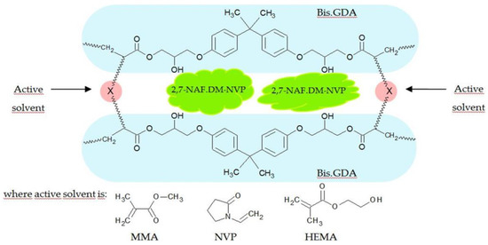 N-vinyl-2-pyrrolidone (NVP) (Fluka), methyl methacrylate (MMA) (Sigma Aldrich), and 2-hydroxyethyl methacrylate (HEMA) (Fluka) were used as active solvents and bisphenol A glycerolate (1 glycerol/ phenol) diacrylate (Bis.GDA) (Sigma Aldrich) was used as a main monomer in the synthesis of the composites. 2,2-dimetoxy-2-phenylacetophenone (Irqacure® 651) (Fluka) was added to these mixtures as a photoinitiator of UV polymerization. As a photoluminescent filler, the powdered copolymer of N-vinyl-2-pyrrolidone with the 2,7-(hydroxy-3-metha-cryloyloxypropoxy)naphthalene (2,7-NAF.DM) form was applied, whose synthesis is detailed elsewhere [24].