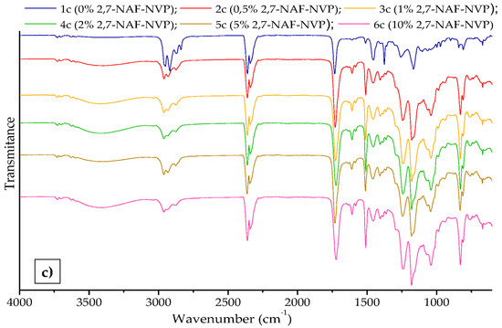 ATR/FT-IR spectra of the composites: (a) samples with MMA (methyl methacrylate), (b) with NVP (N-vinyl-2-pyrrolidone), and (c) with HEMA (2-hydroxyethyl methacrylate).
