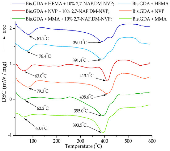 The DSC analyses show some similarities in the thermal behavior of the obtained materials. It can be seen that, for six chosen composites, a change in the filler content of the sample has no significant effect on the shape of the DSC curves (Figure 3). Table 2 contains numerical data determined from the DSC curves after the heating cycles. Comparing the obtained results, a clear endothermic effect connected with the maximum degradation of the samples is visible. The values of Tmax temperatures are in the range of 390.1–413.1 °C. Besides this, on all curves one see a small endothermic peak (T1) at a temperature between 60.4 and 81.2 °C. This effect is probably a result of the evaporation of small amounts of unreacted monomers. For the studied samples, no exothermic effects occur during heating.