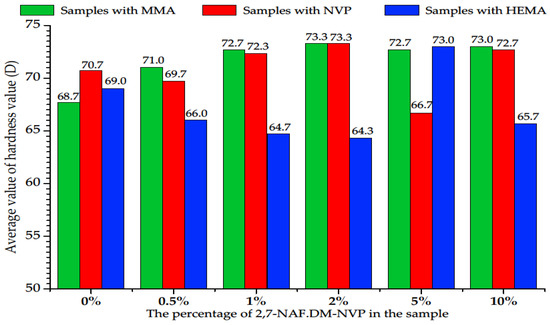The values of hardness were expressed in the D scale and are presented in Figure 4. The hardness of the samples was in the range from 64.3 to 73.3 units.