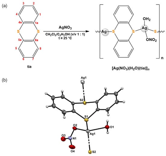 (a) Schematic presentation of the synthetic route and (b) ORTEP drawing of silver(I) complex with thianthrene (tia), [Ag(NO3)(H2O)(tia)]n complex.
