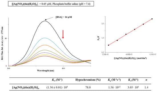 Serum albumin is a protein in the blood plasma, which plays a crucial role in the transport and metabolism of pharmacologically active compounds [8]. The affinity of [Ag(NO3)(H2O)(tia)]n complex to BSA was studied using florescence quenching experiments. As can be seen from Figure 2, BSA exhibits very intensive fluorescence at 365.0 nm, with intensity significantly decreasing upon addition of the studied complex (0–65 µM). This can be the consequence of the complex binding to this biomolecule, resulting in the changes of its tertiary structure [8]. The data obtained by using Stern-Volmer and Scatchard equations (Stern–Volmer constants (Ksv), quenching rate constants (Kq), binding constants (KA) and number of binding sites per BSA (n)) are also presented in Figure 2. The Kq value indicates that the investigated silver(I) complex shows good quenching ability of the BSA fluorescence (Kq ~1013 M−1s−1), being higher than the corresponding values of bimolecular dynamic quenchers (2·1010 M−1s−1).