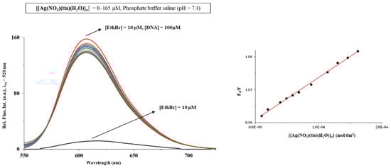 Fluorescence emission spectra of EthBr-DNA system in the presence of an increasing concentration of [Ag(NO3)(H2O)(tia)]n complex. Inserted graph: Stern–Volmer plot of F0/F vs. [complex].