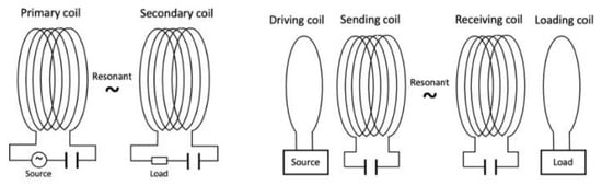 Typical models of two-coil (left) and four-coil (right) magnetically coupled resonant wireless power transfer (MR-WPT) systems.