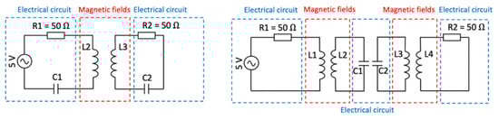 Figure 2 shows the schematics of the two-coil and four-coil systems simulated within the COMSOL package. The coil models (noted in the red region in Figure 2) were drawn and simulated in the frequency domain using magnetic field physics. The electrical components interfaced with the coils (noted in the blue region in Figure 2) were set up using electrical circuit physics.