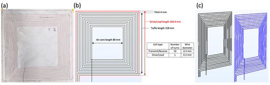The coils were simulated by 0.3 mm thick solid copper wire, modeling the embroidered litz wire coils. Figure 3a shows the photograph of the textile coils sewn on the surface of the textile. The silk-coated copper litz wires consisted of 36 individual strands of 40 µm copper wires having an overall diameter of 0.3 mm. The geometry and layout of the coils forming the transmitter (Tx) are shown in Figure 3b. The black coil represents the transmitting coil L2, and the red loop placed outside L2 with a 4 mm pitch represents the driving coil L1, which is only used in the four-coil system. Figure 3c shows that the transmitter Tx and receiver Rx of the four-coil system were separated by a given distance, which would be varied in the simulated magnetic field analysis.