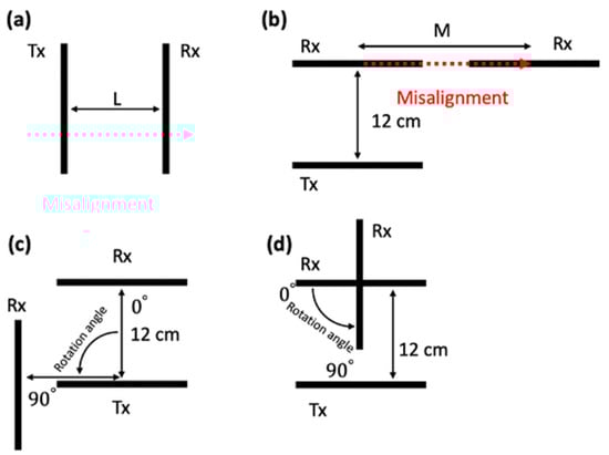 Figure 4 shows the top view of the transmitter and receiver for four dependent studies. The transfer distance is defined as the coil separation L in Figure 4a and varied from 0 to 20 cm. The misalignment distance L in Figure 4b varied from 0 to 14 cm. The rotation angle varied from 0 to 90 degrees for the two rotating cases shown in Figure 4c,d.