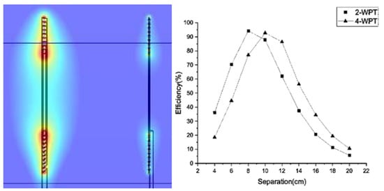 The simulated magnetic fields are shown in Figure 5. The results of the coil separation study are shown as plots of the power transfer efficiency against the separation distance in Figure 5, where the efficiency had peak values over 90% at 8 cm of separation for the two-coil system and 10 cm of separation for the four-coil system.