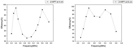The four-coil system had a longer frequency-splitting range of 10 cm than the two-coil system (8 cm). From Figure 7, the two frequencies possessing the peak power efficiencies tended to unify when the coil separation was increased from 4 cm to 10 cm.