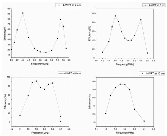 The MR-WPT efficiency of the four-coil system analyzed in frequency domain at a separation of 4 cm, 6 cm, 8 cm and 10 cm.