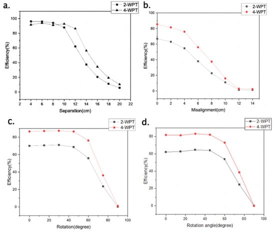 The power efficiency performances of axial misalignments from 4 cm to 14 cm at 12 cm of coil separation are plotted and shown in Figure 8b. A linear drop was observed at a 4 cm misalignment distance for both systems. For the angular misalignment, Figure 8c,d shows that the efficiency remained stable up to a 45 degree angle of the receiver coil with respect to the transmitter, after which it decreased linearly.