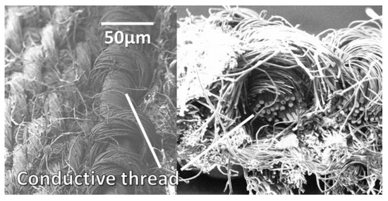 Scanning electron microscope (SEM) image of the surface (left) and cross-section (right), showing the conductive Litz wires, of the antenna.