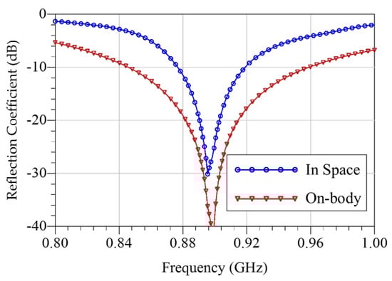 The fabricated antenna’s bandwidth has been measured using a Rohde & Schwarz ZVB4 (Germany) vector network analyzer (VNA). Figure 3 shows the measured return loss of the antenna, showing its bandwidth covering the 915 MHz ISM-band. The antenna’s radiation characteristics have been obtained from CST 3D field monitors in simulation as well as measured experimentally. The forward transmission between two identical textile antennas has been measured with the path losses estimated using the Friis free space propagation model. Table 1 shows the simulated and measured antenna characteristics, demonstrating higher radiation efficiency than textile antennas, such as [2], due to the lower dielectric losses associated with a monopole antenna compared to a microstrip patch, with minimal impact of the substrate’s thickness and dissipation factor.