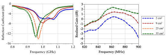 To seamlessly integrate the antenna in textiles, the ground plane needs to be minimized to the minimum area which fits the rectifier’s components. However, the 50 Ohm matching of the monopole is expected to be affected by the size reduction. Figure 4 shows the measured return loss and gain of the stitched monopole with different ground-plane sizes. While it is observed that the impedance matching quality reduces with ground planes smaller than 25 cm2, the impact on the realized gain has been less than −2 dB demonstrating the suitability of a textile monopole of 2 cm2 ground plane.