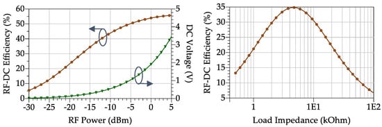 RF-DC Power conversion efficiency of the textile rectifier for different RF power levels (left) and load impedances (right).