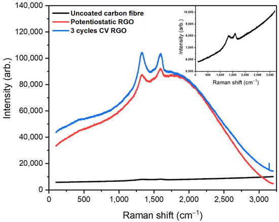 Raman spectrum (obtained using a 785 nm laser) of uncoated carbon fibre (black), carbon fibre coated with rGO by potentiostatic deposition (red) and carbon fibre coated with rGO using 3 CV cycles (blue).