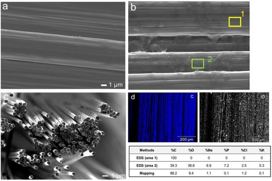 Scanning electron microscope image (a) uncoated carbon fibre; (b) carbon fibre coated with rGO using 3 CV cycles (table gives values for areas not coated (area 1) and coated with rGO (area 2); (c) bundle of bare carbon fibre; (d) Energy-dispersive X-ray spectroscopy (EDS)—mapping images of the 3 CV cycles rGO showing chemical composition of Carbon and Oxygen.