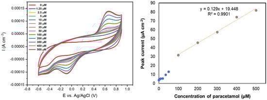 (left) Cyclic voltammograms (50 mV s−1) of paracetamol (0–500 µM) in 0.1 M PBS solution using a carbon fibre coated with rGO deposited using 5 CV cycles; (right) Calibration curve for the same rGO-coated carbon fibre in solutions of paracetamol (0–500 µM) in 0.1 M PBS solution.