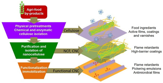 Several remarkable NC properties (mechanical, chemical, and optical) have been exploited to develop NC-based advanced materials. For example, NC is used in biomaterials, energy storage, water treatment, and composite materials [13]. In foods, due to its rheological behavior and water absorption, NC can find use as (i) a stabilizing or emulsifying agent, (ii) a functional food ingredient, or (iii) in food packaging [14].