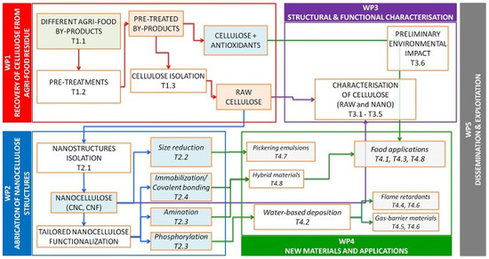 Several elements of novelty are involved in this project. First of all, the application of proprietary technology (modified HPH system) represents an original approach to develop a simpler and greener recovery of cellulose by avoiding/reducing chemical pretreatments and using only coarsely milled materials. The aqueous AFR suspensions obtained by HPH are made of finely milled cellular debris, where cellulose is partly defibrillated and activated. This technology has already been tested on tomato peels, spent coffee grounds, sesame seeds, and vegetable tissue [16,17,18]. The full exploitation of micronized by-products in final products, such as edible coatings and films, or oil structuring systems, investigated in WP4 by combining partly activated cellulose with other bioactives naturally contained in the residues [15], also represents an original approach.