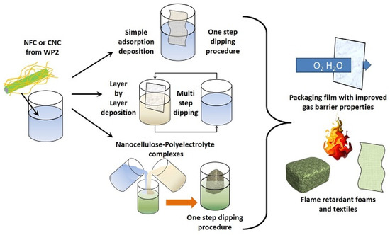 - Replacement of traditional flame-retarding polymers, based on halogenated additives, posing severe environmental and health concerns, with approaches employing NC as building block for gas barrier and flame retardancy coatings,