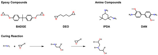 Top: Chemical structures of the epoxy compounds bisphenol A diglycidyl ether (BADGE) and 1,2,7,8-diepoxyoctane (DEO) as well as the amine compounds isophorone diamine (IPDA) and o-dianisidine DAN. Bottom: Curing reaction of epoxy compounds with primary amines.