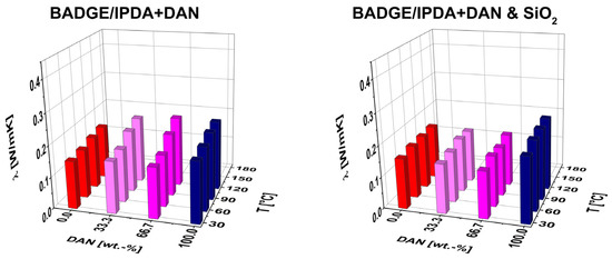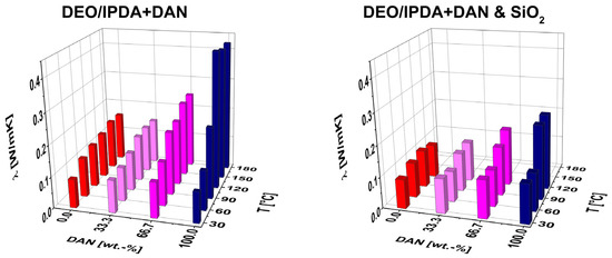 The thermal conductivities of the resins and composites based on DEO, by opposite, correlate with the temperature and absence/presence of inorganic particles: At 30 °C, the thermal conductivity of the resins as well as the composites covers a pronouncedly low range of only 0.08 to 0.15 W·m−1·K−1. Starting from elevated temperatures of 90 °C, the specimens that contain low amounts of DAN (0 and 33 wt.-%) show no significant alteration of the thermal conductivity. On the other hand, the thermal conductivity of resins with high amounts of DAN (67 and 100 wt.-%) is increased. This increase of the thermal conductivity is more pronounced in the resins that were cured with DAN only. Above 120 °C, the thermal conductivity does not further increase. By contrast, the composites filled with silica nanoparticles reproduce this trend to lesser extent.