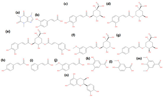 The main compounds showing antioxidant activity, present in coffee silverskin: (a) caffeine, (b) caffeic acid, (c) 3-caffeoylquinic acid, (d) 5-caffeoylquinic acid, (e) 3,5-dicaffeoylquinic acid, (f) 3-feruloylquinic acid, (g) 3-p-coumaroylquinic acid, (h) p-coumaric acid, (i) trans-cynnamic acid, (j) ferulic acid, (k) gallic acid, (l) vanillic acid, (m) syringic acid, and (n) epicatechin.