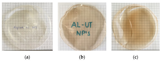 Physical appearance of alginate with Uncaria tomentosa (UT) extract powder: (a) Alginate-Poloxamer 0.5% (control); (b) Alginate-Poloxamer 0.1%-UT0.1%; (c) Alginate-Poloxamer 0.5%-UT0.1%.