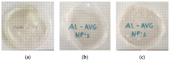 Physical appearance of alginate with aloe vera gel: (a) Alginate-Poloxamer 0.5% (control); (b) Alginate-Poloxamer 0.5%-aloe vera gel (AVG)10%; (c) Alginate-Poloxamer 0.5%-AVG25%.