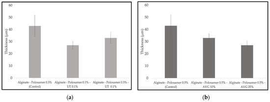 Figure 3 shows the thicknesses of alginate membranes, UT and AVG, which are between 27 and 33 µm. The control film’s thickness was 43 µm. The addition of cat’s claw or aloe vera gel decreased the film’s thicknesses. Moreover, the increase of aloe vera gel content reduced the thickness even more.