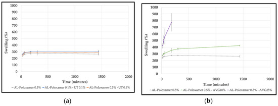 Swelling behavior of: (a) alginate with UT extract powder films; (b) alginate with AVG films.