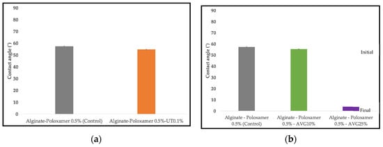 Wettability of: (a) alginate with UT extract powder films; (b) Alginate with AVG films.
