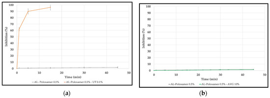 Figure 8 shows the antioxidant activity of the alginate films with the natural compounds. The film with UT shows an excellent antioxidant activity with almost 100% of inhibition after 15 min compared with the control film–alginate and poloxamer only–which has less than 5% of inhibition even after 45 min. On the other hand, the film with AVG 10% has a similar activity to the control film. The AL-AVG25% film could not be evaluated because it dissolved in the solvent.