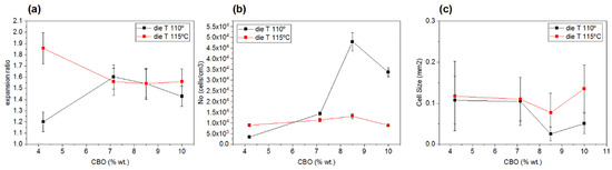 As can be seen in Figure 1c and Figure 2, foams present large pores with significant cell size variability. The two die temperatures used did not produce any difference in the obtained cell size for CBA concentrations of 4.2 and 7.1% wt. Cell size decreased for 8.5% wt. as cell population density increased. This inverse trend has been previously reported [12]. This effect is particularly significant for the 110 °C die T° trial, where the average cell size was reduced by more than 50%. After this point N0 decreased again and cell size increased. This can be explained as the increase of CBA provides more available gas for cell nucleation, until a maximum is reached. With further gas increase and cell growth, cells collide against each other, reducing the n° of cells and increasing their size [13], as can be observed by the trends in Figure 1b,c.