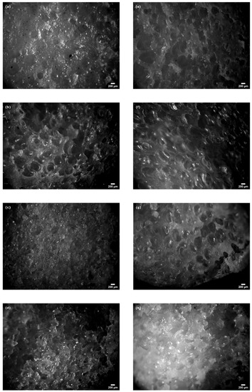 Micrographs of obtained foams under different process conditions: die T° = 110 °C and 4.2% CBA (a); 7.1% CBA (b); 8.5% CBA (c) and 10% CBA (d) die T° = 115 °C and 4.2% CBA (e); 7.1% CBA (f); 8.5% CBA (g) and 10% CBA (h).