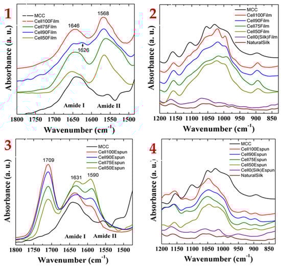 Figure 1. FTIR spectra comparing EMIMAc generated films and their electrospun nanomaterials in the regions of 1500–1800 cm−1 and 800–1200 cm−1. (1) and (2) depicts the FTIR spectra of EMIMAc generated films (MCC: Microcrystalline Cellulose; Cellx: x denotes the percentage of cellulose in the cellulose-silk composite. (3) and (4) depicts the electrospun nanomaterial samples as compared to MCC.