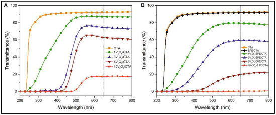 As for the V2O5/CTA serie, 3V2O5/CTA, 5V2O5/CTA and 10V2O5/CTA nanocomposites presented transmittance values nearby to 0% until 400, 450 and 500 nm, respectively. This can indicate that these nanocomposites absorb UV radiation, which would protect them from the deterioration caused by it. Nevertheless, only 3V2O5/CTA and 5V2O5/CTA displayed this property with high transparency. On the other hand, in the case of nanocomposites with EPE triblock copolymer, 5V2O5-EPE/CTA and 10V2O5-EPE/CTA presented these UV-shielding properties, although they also showed a decrease in the transparency.