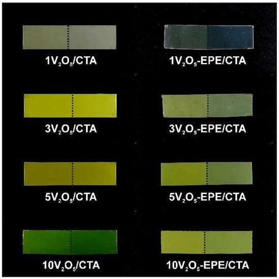 Digital images of V2O5/CTA and V2O5-EPE/CTA nanocomposites prepared by SVA before (left part) and after (right part) irradiation.