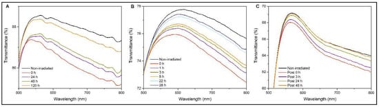 Magnification of UV-vis spectra of (A) 1V2O5/CTA, (B) 1V2O5-EPE/CTA and (C) 3V2O5/CTA nanocomposites prepared by SVA in a function of time before and after irradiation.