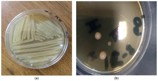 Six soil samples were collected from the agricultural crops of argan oil (Argania spinosa) in Taroudant, a southwestern region of Morocco. Four thermo-resistant bacterial species were isolated from all six soil samples. Only one different bacterial species, represented in Figure 1a,b, was isolated from a location in proximity of an urban area where wastewater and garbage contaminate the argan field. Recent works indicated the presence of six different bacterial strains of PHB producers isolated from sewage samples. Among all the isolated species, one Strain 11 produced 45.9% of PHB by using glucose as the sole carbon source [20]. From this perspective, this work aimed to isolate new bacterial strains able to synthesize the biopolymer PHB, to subsequently optimize the synthesis, modification, and biodegradation processes of the polymer by using the argan waste biomass.