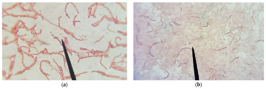 The endospore was also stained using a variation of Methylene Blue, which was used as a coloring alternative to Malachite Green in staining the bacterial species Bacillus subtilis and Clostridium tetani by Okatari et al. In this recent work, the endospore staining properties of Methylene Blue were investigated using differently concentrated solutions of the dye at different pH levels. Their work demonstrated that the species Bacillus subtilis are well stained at an optimal stain concentration of 0.5% and pH 12, while in staining the species Clostridium tetani, the optimal concentration was 0.5% at pH 11 [19]. In following this alternative, this study adopted confirmatory staining that was performed by using the Schaeffer-Fulton staining method where the conventional Malachite Green dye was substituted by an alcoholic solution of Methylene Blue 0.5% at pH 12. The pH and concentration parameters selected for this work correspond to the optimal staining conditions of the bacterial species Bacillus subtilis since the morphological analysis previously conducted may suggest that the species isolated belongs to the genus Bacillus. After staining with Methylene Blue 0.5% at pH 12, the specimens were counter-stained with Safranin. The colored specimens were observed under the compound light microscope at 1000× in oil immersion. Figure 2b shows how the bacterial endospores retained the blue color of the Methylene dye, which passed through the endospore membranes and colored the internal granules.